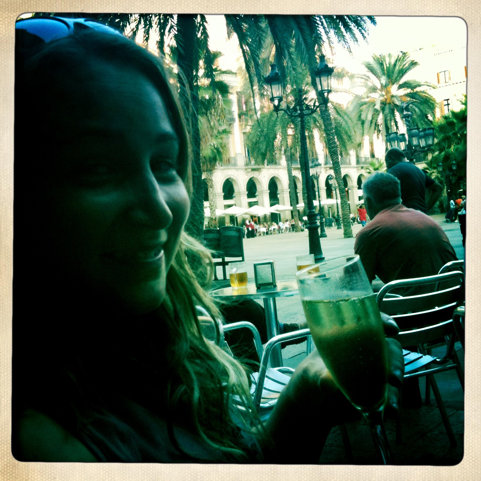 Bon, c'est l'heure de l'aperitivo, nous retournons donc vers La Rambla et trouvons une jolie terrasse sur une grande place, sorte de cour intérieure publique. Et je me lance, je décide de commander un verre de cava. Ça m'a été conseillé par FM, mais je n'ai aucune idée de ce que c'est... une anisette? du vin blanc? un porto? Je me lance et je ne suis pas du tout déçue. C'est du Champagne! Ou plutôt du vin mousseux espagnol!