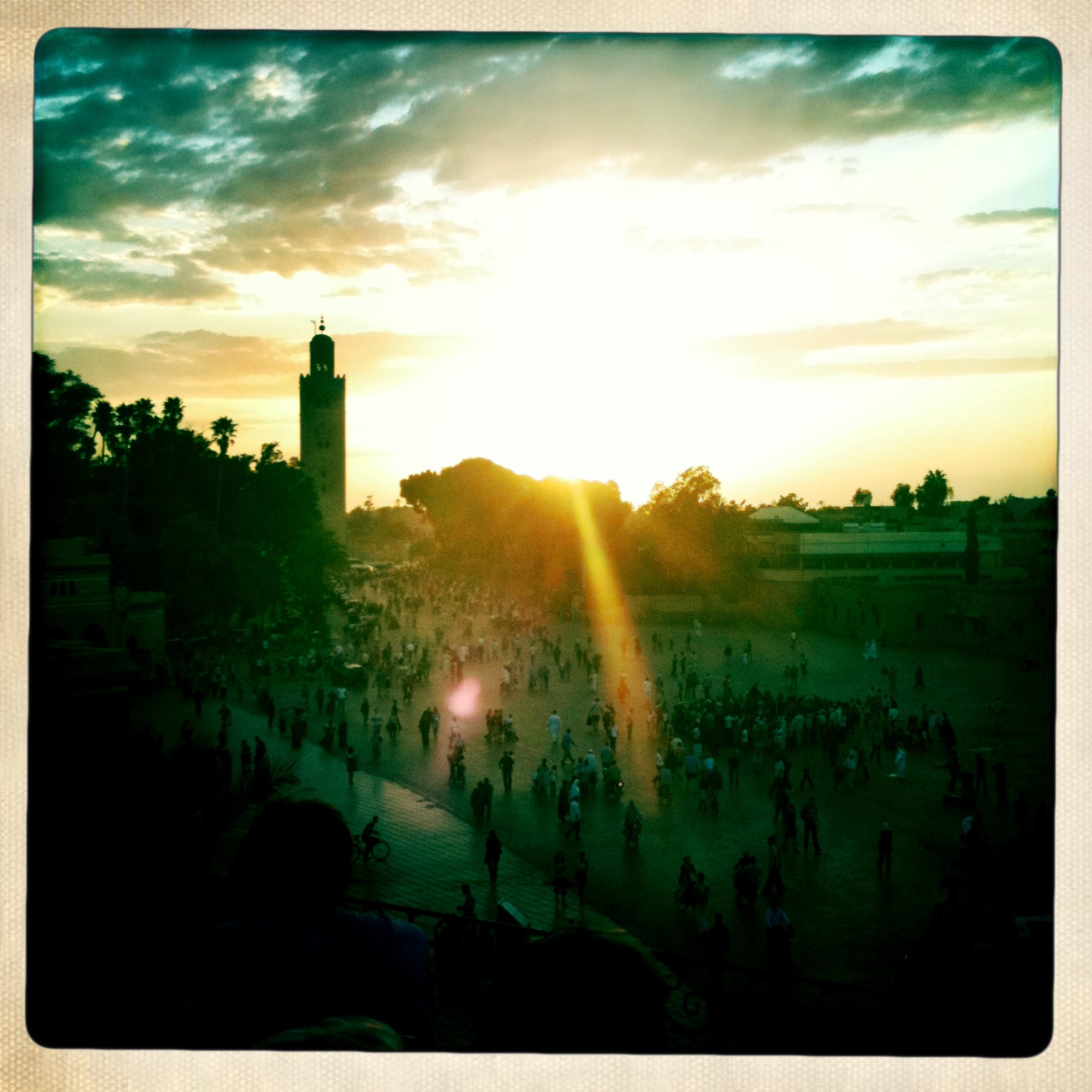 Le lendemain de notre arrivée nous avons décidé de faire une promenade dans la médina... après plusieurs fois perdus, plusieurs fausses indications données par de gentils marocains (!), beaucoup de sollicitation pour acheter foulards, djellaba, babouches, nous nous sommes finalement retrouvés à la Place Jemaâ el Fna vers la fin de l'après-midi. L'heure idéale pour voir s'installer les nombreux kiosques de nourriture (merguez, escargots, jus d'orange...), les charmeurs de serpents, les singes, les danseurs. Une heure plus tard, sous un magnifique coucher de soleil, la place s'est animée comme par magie. Nous avons décidé de nous mettre dans l'ambiance et de prendre un petit quelque chose à grignoter chez Aicha, le meilleur kiosque, sur recommandation!
