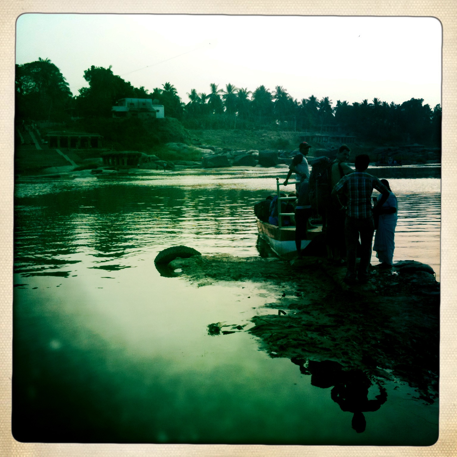 Nous habitions à Virupapur Gaddi, connu sous le nom de "Hippie island", plus relaxe et accessible seulement par un service de petit bateau moteur fonctionnant de 7h à 18h. On rempli le bateau beaucoup plus qu’à sa capacité, on fait 60 secondes de moteur et on débarque parfois sur la terre ferme, parfois sur un rocher à 3 mètres du bord, ou bien dans un maréquage boueux. Hampi c’est aussi une ville sainte, donc pas d’alcool ni de drogue. Mais les grosses “quilles” de Kingfisher ça ne compte pas et de la boucane, il y en a! C’est vraiment un repère de backpacker dont un sur trois a des dreads!