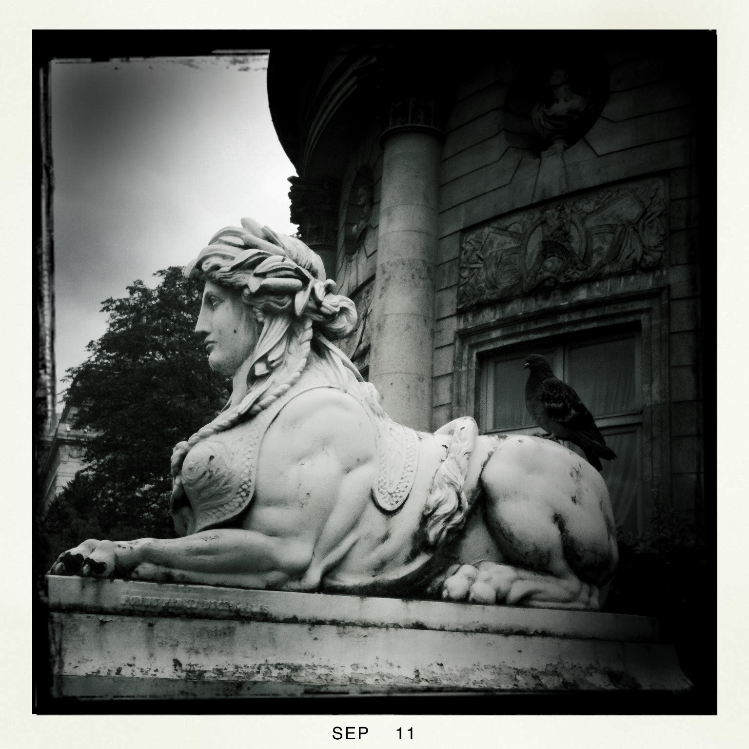 Photographie cocasse. Cet espèce de Sphinx orne le portail d'entrée d'un bâtiment, quelque part dans Paris. J'ai trouvé comique de voir le pigeon, triomphant, installé sur le postérieur du Sphinx comme un conquérant. On dirait qu'il dit: "Veni, vidi, vici".