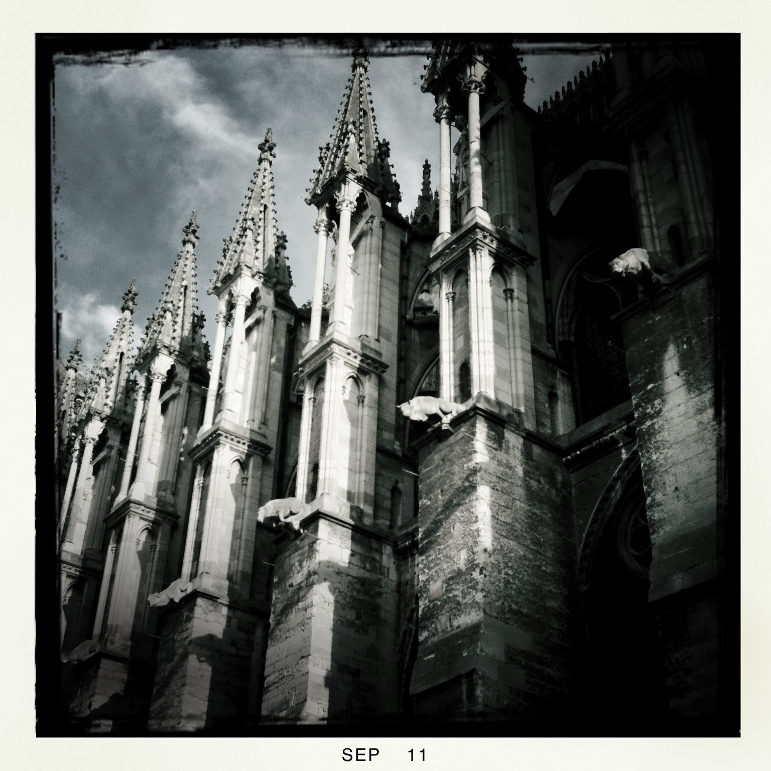Nous avions fait le détour par Reims pour le champagne, mais ce qui m'a finalement intéressé le plus c'est la superbe cathédrale gothique de Reims. Elle est très photogénique et j'ai eu du mal à choisir. Le noir et blanc et le ciel ajoutent à l'effet dramatique de la photographie. Une anecdote de voyage accompagne cette image: lorsque nous sommes sortis des caves de Pommery, nous devions appeler sans faute le propriétaire de l'appartement que nous souhaitions louer au Cap d'Agde. Comme notre téléphone était à sec, nous avons trouvé une cabine téléphonique. Je plante ma carte de crédit dans le téléphone et nous réglons les détails de la location. Tout heureux que ce soit réglé, nous partons à pieds visiter la cathédrale. Une heure de marche plus tard, trente minutes de visite de la cathédrale et une autre bonne demie-heure d'apéro sur une terrasse je m’aperçoit que ma carte de crédit manque à l'appel! Merde! Cinq minutes de sueur plus tard, je réalise que la carte est restée dans le téléphone! Nous sautons dans un taxi, le chauffeur a peu d'espoir pour nous, mais notre bonne étoile est toujours là et ma carte aussi!