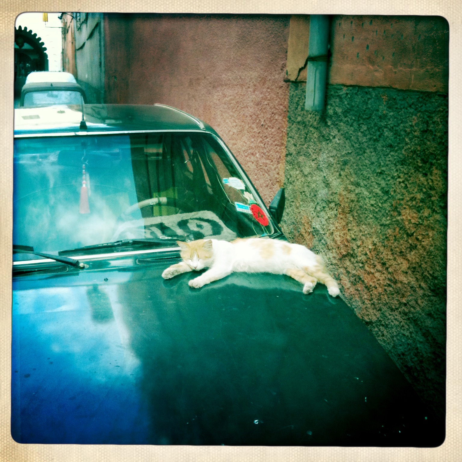Ceux qui ont fait le tour des photos ont sûrement remarqué que j'aime bien les animaux, et j'aime les prendre en photo. Ce petit chat prenait ses aises en somnolant sur le capot d'une vieille bagnole. J'ai pris cette photo en un instant sans vraiment cadrer (chose difficile avec le iPhone en plein jour) et le résultat est plutôt intéressant. Le chat se retrouve à l'intersection de plusieurs lignes qui marquent la séparation entre différentes couleurs chaleureuses, typiques des ruelles de la médina de Marrakech.
