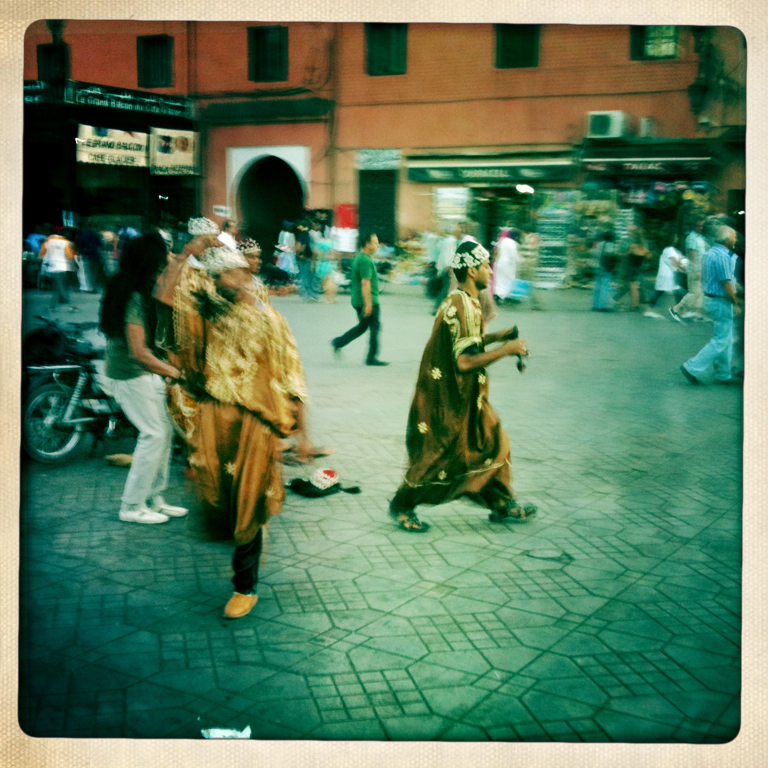 Voilà un résultat dû tout à fait au hasard. La fin de journée arrive sur la place Djemaa el-Fnaa et les amuseurs publics de toutes sortes s'installent pour la soirée. Je vois ces types qui jouent de leurs instruments et je m'installe pour une photo. Avant même que j'ai le temps de prendre le cliché, un des membres s'élance vers moi pour passer le chapeau. Il se retrouve flou sur la photo, à gauche, en train d'enlever son chapeau. Je trouve le résultat particulièrement intéressant parce que tout est flou sauf le musicien au centre (il l'est un peu aussi, limitation du iPhone). Il y a un effet de mouvement, une dynamique dans la photo que je n'ai pas souhaité mais qui en fait une image intéressante. Et les couleurs Hipstamatic y sont pour beaucoup...