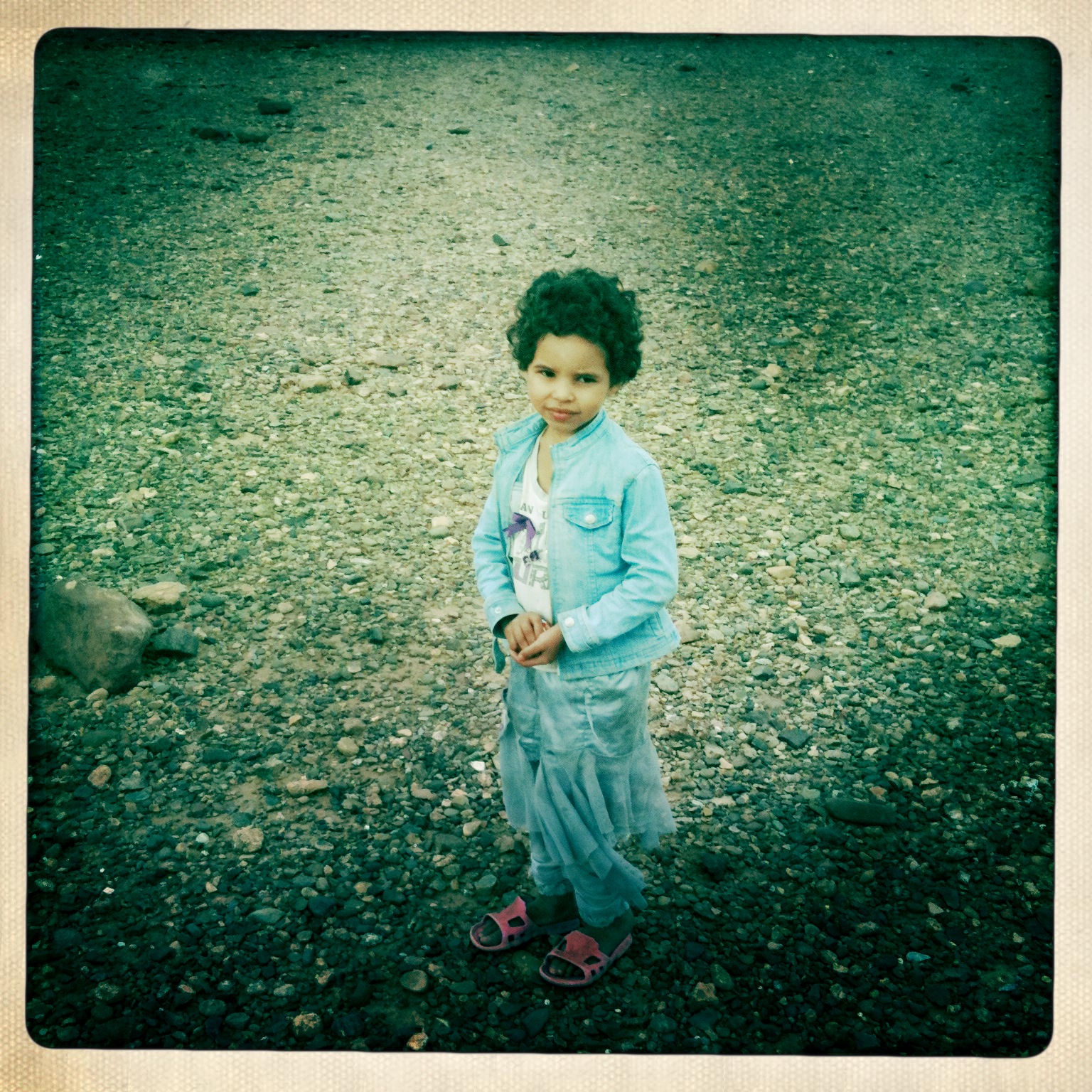 Pendant notre tour du sud du Maroc, lorsque notre guide faisait une halte pour nous montrer quelque chose d'intéressant, des enfants surgissaient de partout pour tenter leur chance. Ils espéraient de nous un petit bonbon ou un jouet. N'importe quoi leur donnait le sourire. Cette petite est restée avec nous quelques minutes et je l'ai prise en photo à la sauvette après qu'on lui ait donné un petit quelque chose. Je n'ai pas osé prendre mon temps, bien cadrer pour prendre une meilleure photographie. Mais le résultat n'est pas si mal, malgré ma gêne.