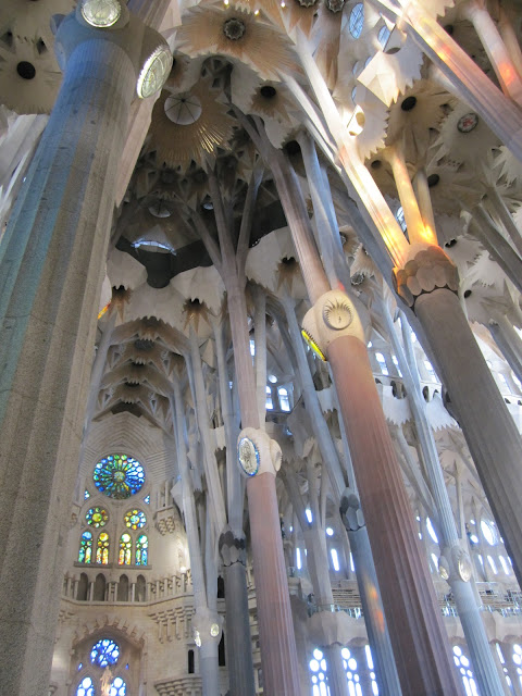 La Sagrada Familia reste le plus beau souvenir que j'ai de Barcelone. Bien sûr c'est une ville excitante et parfaite pour les amateurs de 5 à 7 et de bonne bouffe comme moi. Mais j'ai été complètement époustouflé par cette cathédrale, encore inachevée, de l'architecte espagnol Gaudi. C'est très difficile à décrire mais si on creuse un peu, on comprend que Gaudi était passionné des structures formées par la nature. Il étudiait la forme des arbres, des pétioles des feuilles, des mollusques, etc. Il cherchait constamment à appliquer ses découvertes, faites dans l'étude de la nature, aux bâtiments et structures qu'il créait. Le résultat dans la Sagrada Familia est incroyable. Vous vous retrouvez dans une forêt où les poutres sont des troncs d'arbres de pierre et le plafond, leurs feuilles. La lumière qui pénètre dans la cathédrale est puissante et blanche, car contrairement aux vitraux colorés de d'autres églises, la fenestration ornementale est composée de verre  presque toujours transparent. L'effet est majestueux et, du moins pour moi, inégalé. Vous trouverez des photographies professionnelles qui rendent mieux le bâtiment. Mais celle-ci est pas mal et c'est la nôtre ;)