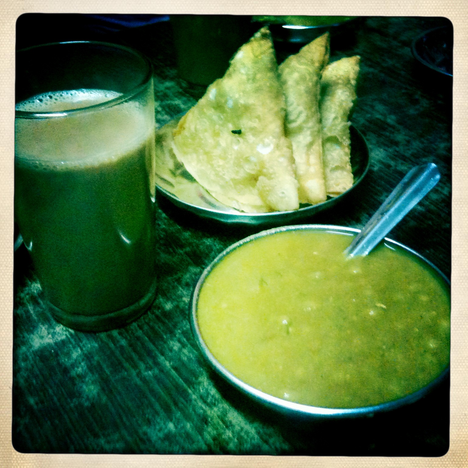 Une des grandes découvertes de notre voyage en Inde, le baji. Au déjeuner, genre de soupe-sauce aux petits pois et pommes de terre, ultra piquante, ça réveille. La première fois on se demande qu'est-ce qu'on fout là, c'est presque hallucinogène. Mais ça a un petit goût de revenez-y. Avec un ou deux ou trois bons samosas et un ou deux chai, un déjeuner à un dollar qui vous rend heureux. Je sais, la photo n'est pas très appétissante...