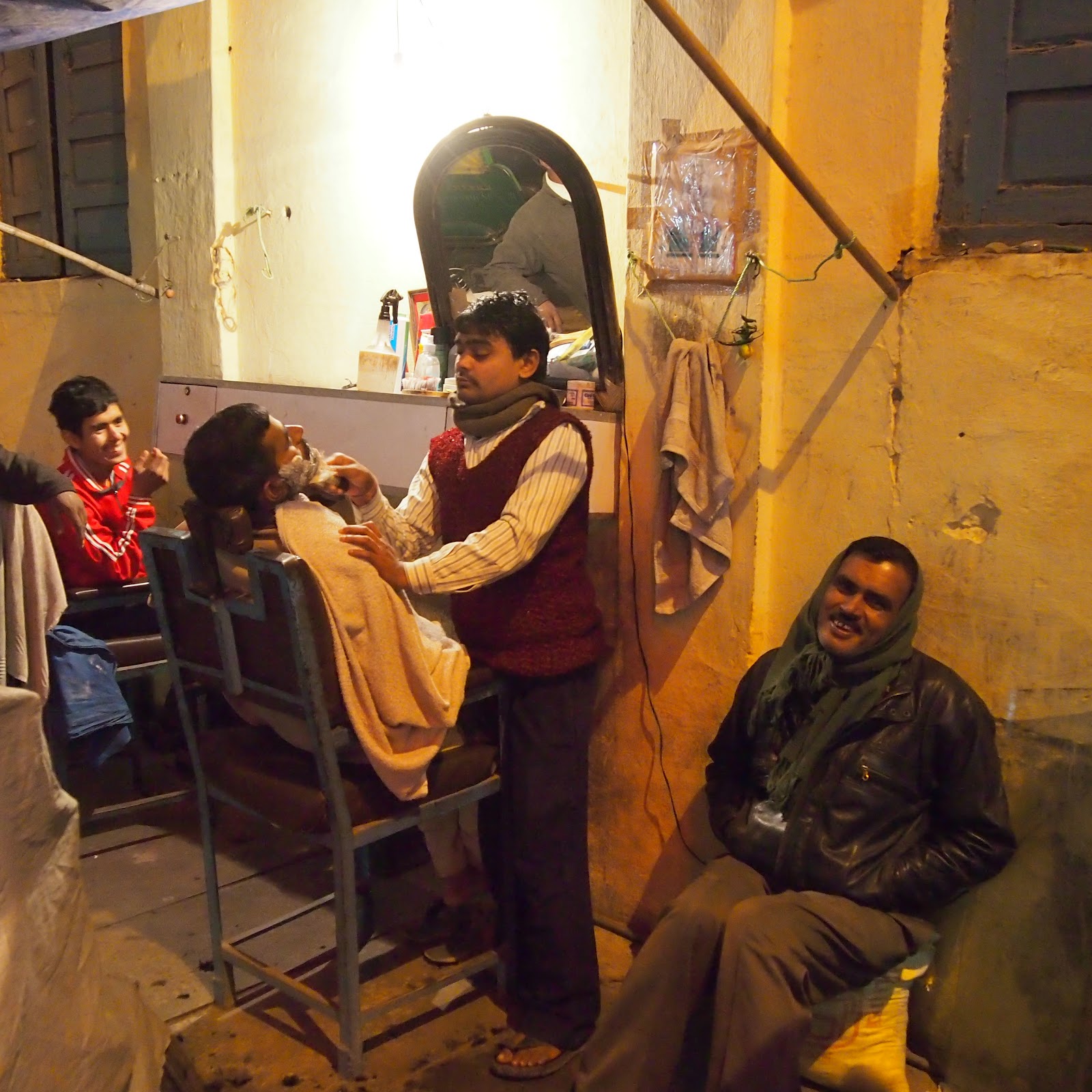 Le genre de chose qu'on trouve normale après un temps en Inde. Un barbier sur le trottoir et à cinq degrés? Pourquoi pas? Le barbier s'appliquait pour montrer son professionnalisme sur ma photo alors que tout le monde, client compris, riait de bon coeur d'être sur ma photo.